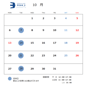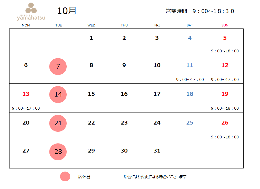 2025年09月23日 10月の営業日 いつもありがとうございます。 やっと秋めいてきた日々ですね。 このすごしやすい日々を有意義に過ごしていきたいなと思います。 10月の営業日のお知らせです。 来月もよろしくお願いいたします。